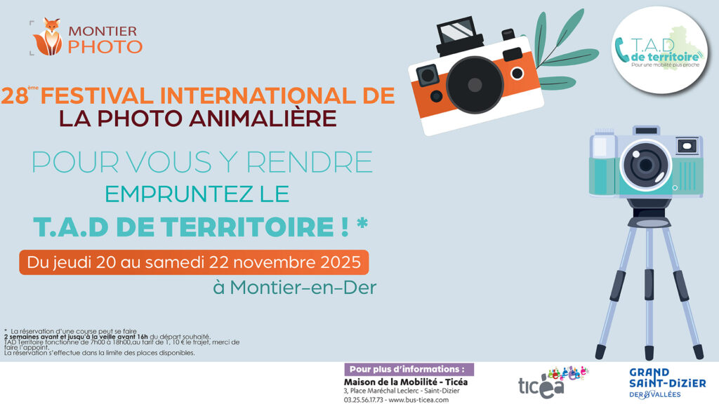 Le Festival international de la photo animalière aura lieu à Montier-en-Der du 20 au 22 novembre 2025. Le service TAD de territoire facilite vos déplacements pendant l’événement.